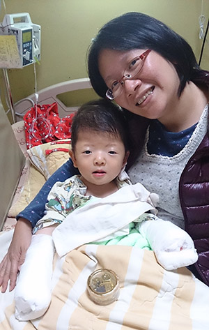 經由一連串的醫療檢查,安安被確診為「亞伯特氏症」,需要一連串的手術來分割他的手指和腳指,頭顱部分也有腦壓升高的危險和智力的隱憂。我和安安接下來的日子,就是奔走於醫院與家中。