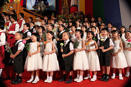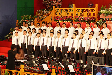讚頌「盼你來」組曲中的第四段──青春時代我遇見了你,而今髮已白⋯⋯是由一群在團體多年、年紀較長的老學員擔綱。他們想把最好的音聲供養師父,期間勤於練唱,體力或有不堪,心力則是愈唱愈強。透過這次的學習,很多人發現對師父、上師恩德的體會更深。以下是北區同修的分享:
